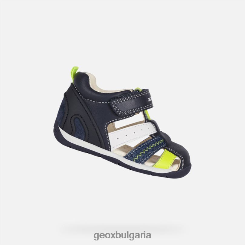 момчешки удобни дишащи сандали за първи стъпки с модерна естетика. всеки е удобен стилен ежедневен сандал, създаден специално за малки деца, които се учат да ходят. изработен от напа и материал с ефект на кожа в тъмносиньо, повдигнат с бели и неоново-жълти акценти, този сандал излъчва съвременен хлад и е идеален за всяко ежедневно облекло.