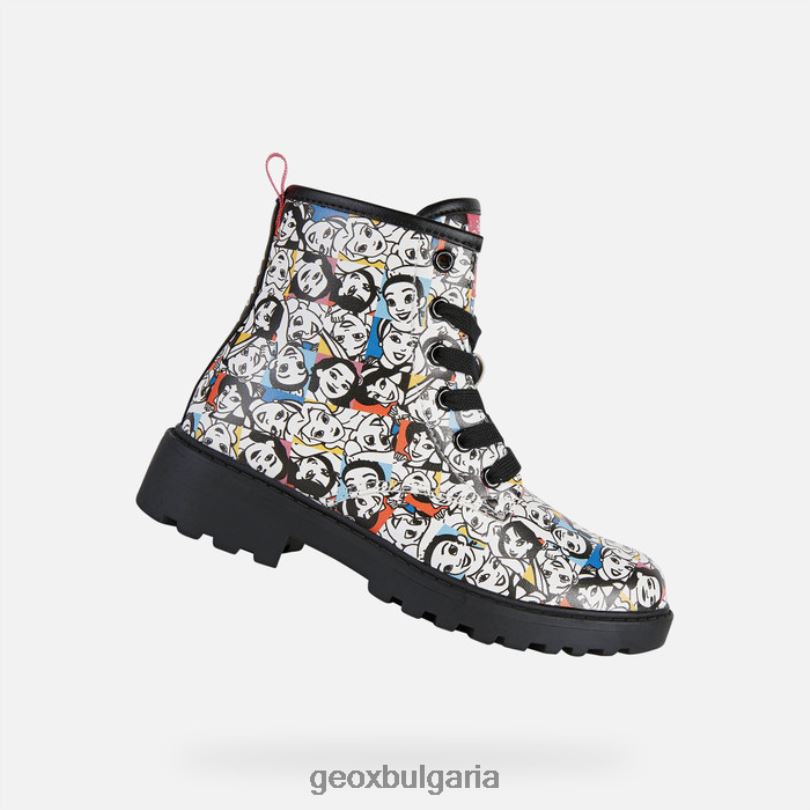 момичешки ботуши с връзки, посветени на принцесите на Дисни. продукт на партньорството между geox и disney, casey е направен от материал с ефект на кожа с бял и многоцветен печат. удобен и дишащ, той има романтична бляскава естетика за модно осъзнати малки мечтатели.