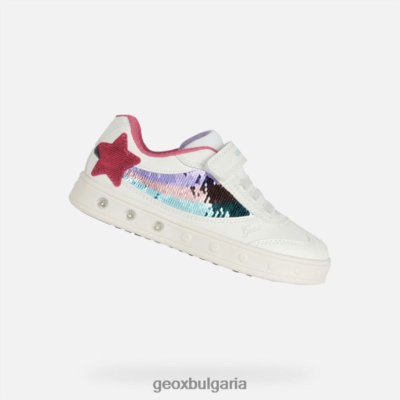 ниски маратонки за момиче със светлини, вградени в подметката и модна активна естетика. skylin се отличава с блестяща бяла горна част с графичен дизайн и красиви петна във формата на звезда, обсипани с многоцветни пайети. изработен от плат и материал с ефект на кожа с атрактивен блясък, той е длъжен да внесе женствен блясък във всяка визия.