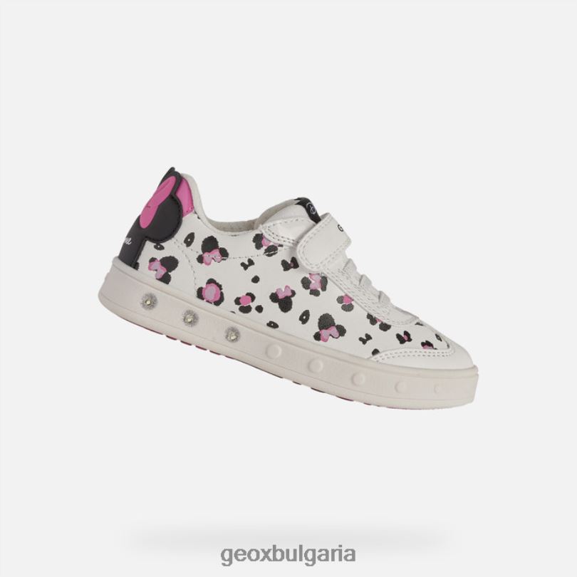 маратонки за момиче, вдъхновени от Мини Маус, със светеща външна подметка. продукт на специалното партньорство между geox и disney, маратонките skylin ще бъдат на мода сред младите фенове на най-известната малка женска мишка в света. удобни и женствени, те също се отличават с външна подметка с вградени светлини, които ще донесат допълнително настроение и забавление на малките момиченца. изработени от материал с щампован кожен ефект, те се предлагат в черно-бяла палитра с розови петна.
