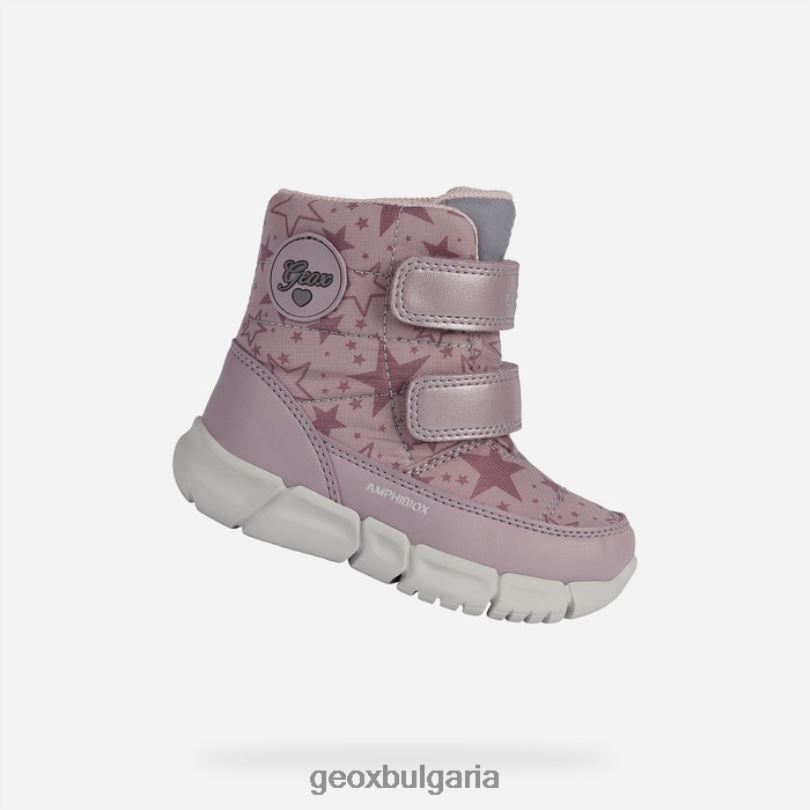 водоустойчиви боти до глезена за момиче, черпещи вдъхновение от традиционните обувки за сняг. осигурявайки превъзходни нива на гъвкавост, flexyper abx е плътно водоустойчиво парче, направено от еконил, устойчив материал, изработен от риболовни мрежи и други видове рециклирана пластмаса. с горна част, изработена от щампован найлон и дюрабък в тъмно-розово-сив цвят, тя лежи върху иновативна външна подметка, която придава на крака ненадмината стабилност и омекотяване.